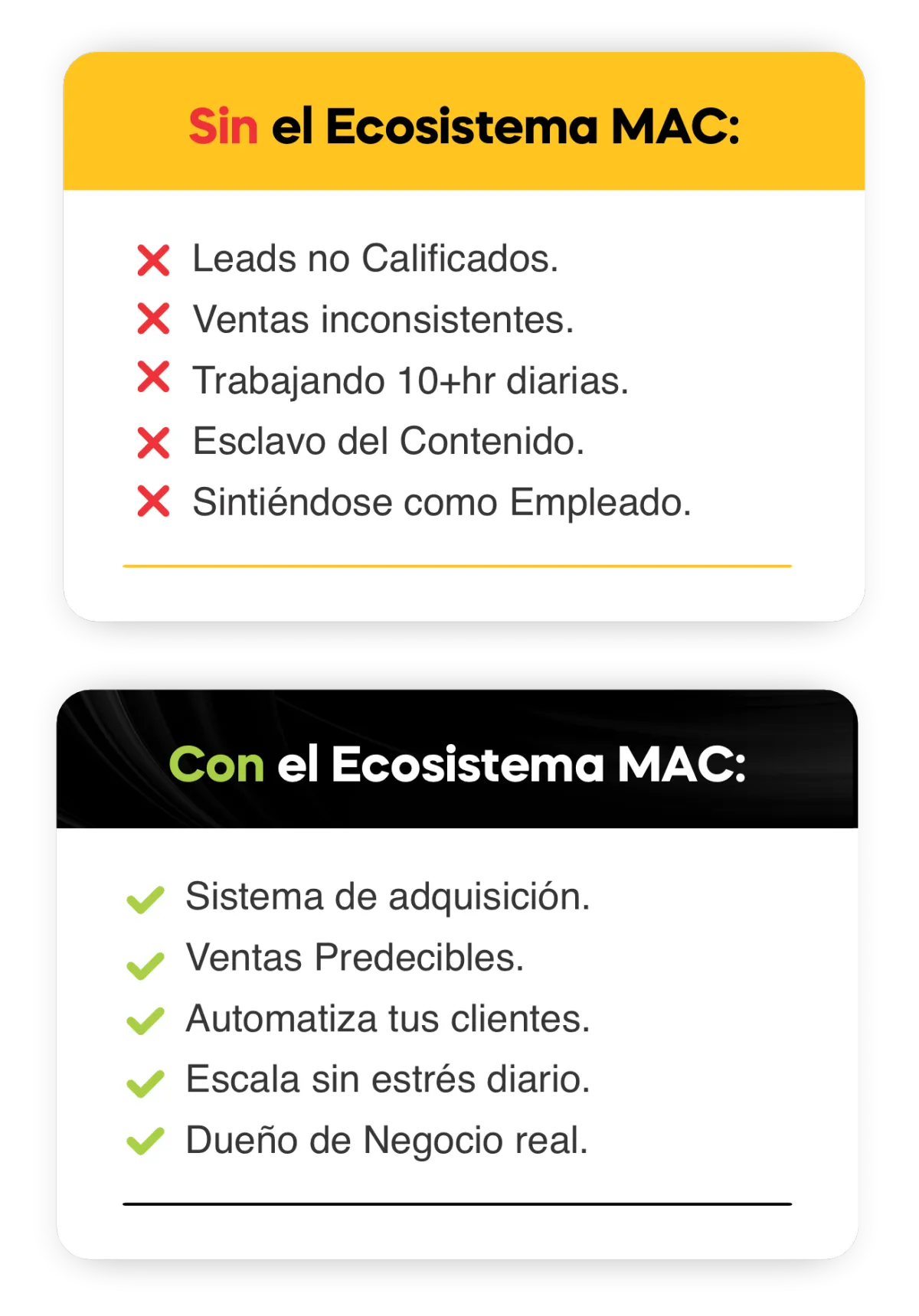 Prueba el Ecosistema MAC completamente sin riesgo por 30 días. Si sientes que no recibiste el valor suficiente para tu negocio - Te reembolsaremos el 100% de tu dinero. Sin preguntas, solo escríbenos a [email protected]